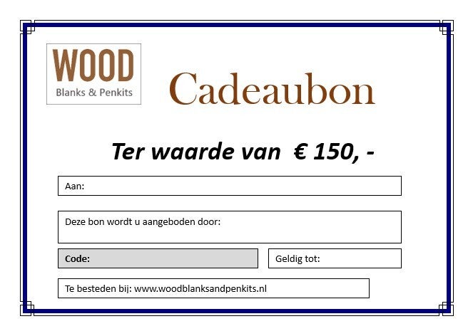 - De code kan verzilverd worden in het afrekenveld bij een bestelling in onze webwinkel: www.woodblanksandpenkits.nl (de code kan 1x gebruikt worden en is een jaar geldig !).