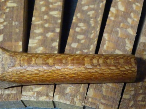 Leopard /Pearlwood (Roupala montana) Boomgrootte 30-40 m Hoog en een stamdiameter van 0,6-1,0 m. Leopard /PearlwoodHeeft een zeer opvallende vlek die dit hout zijn naam geeft. Het hout zelf is medium tot donker roodbruin met grijze of lichtbruine stralen, die lijken op de vlekken van een luipaard.