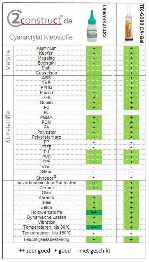 Wij hebben verschillende type CA lijmen zelf getest en voor de afwerking van pennen kwam 2Construct het beste bij ons uit de bus.