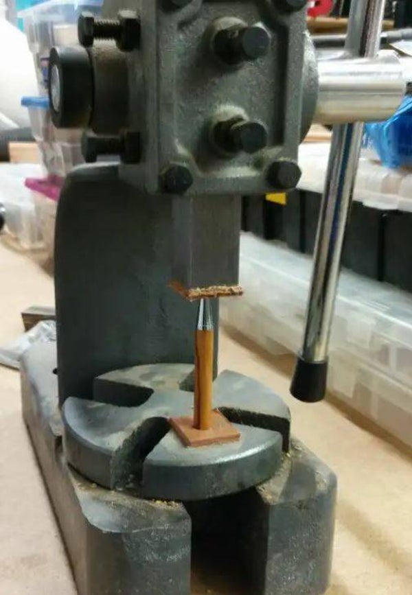 Omdat ik steeds tegen hetzelfde probleem aanliep met het persen van pennen o.a..; het onstabiel persen van de onderdelen waardoor er beschadigingen ontstonden door het omhoog klappen van de pen onderdelen, het stuk gaan van het gedraaide hout enz. De door ons gebruikte verticale persen vond ik verder te licht en gingen snel stuk. Ik kwam deze pers tegen op het penforum waar de penmakers in Amerika al jaren bleken te werkten met deze pers, die eigenlijk werd ontworpen en gebruikt voor het persen van lagers, het klinken van nagels en oogjes, of het ponsen in leer en metaal met een matrijs.