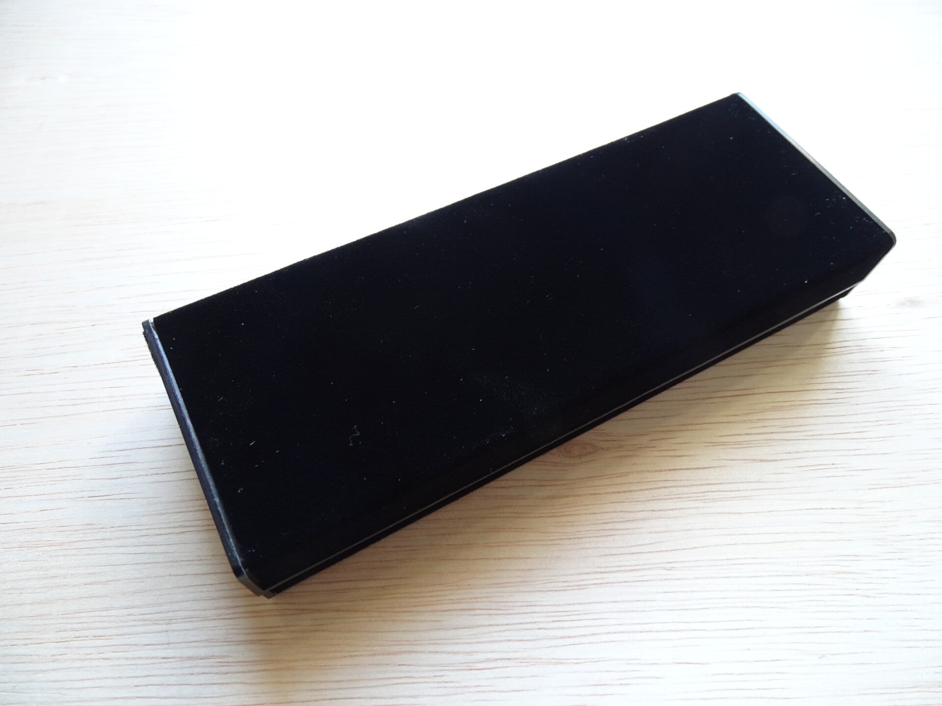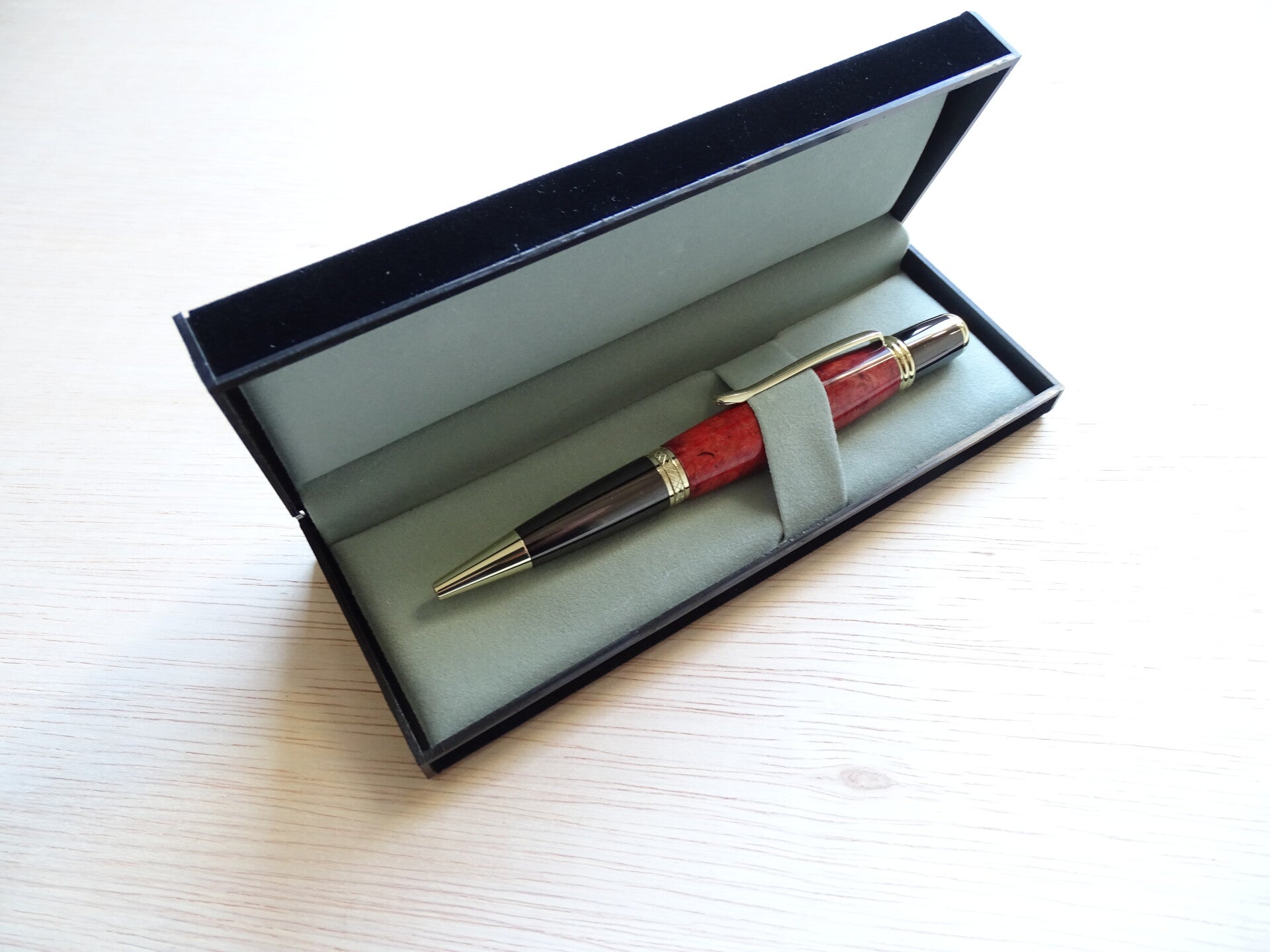 - 1 klap penbox, zwart flueel bekleed, binnenzijde olijfgroen.